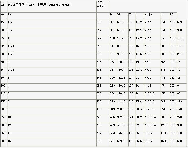 美標(biāo)法蘭截止閥150Lb主要尺寸和重量: