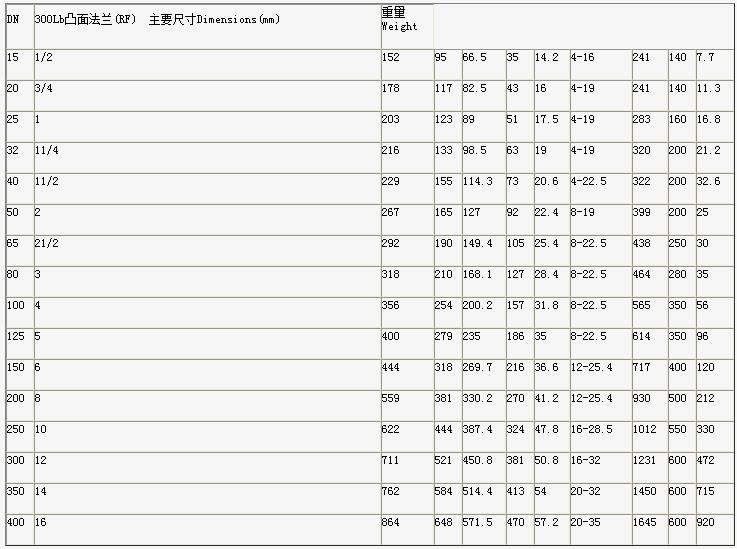美標(biāo)法蘭截止閥300Lb主要尺寸和重量: