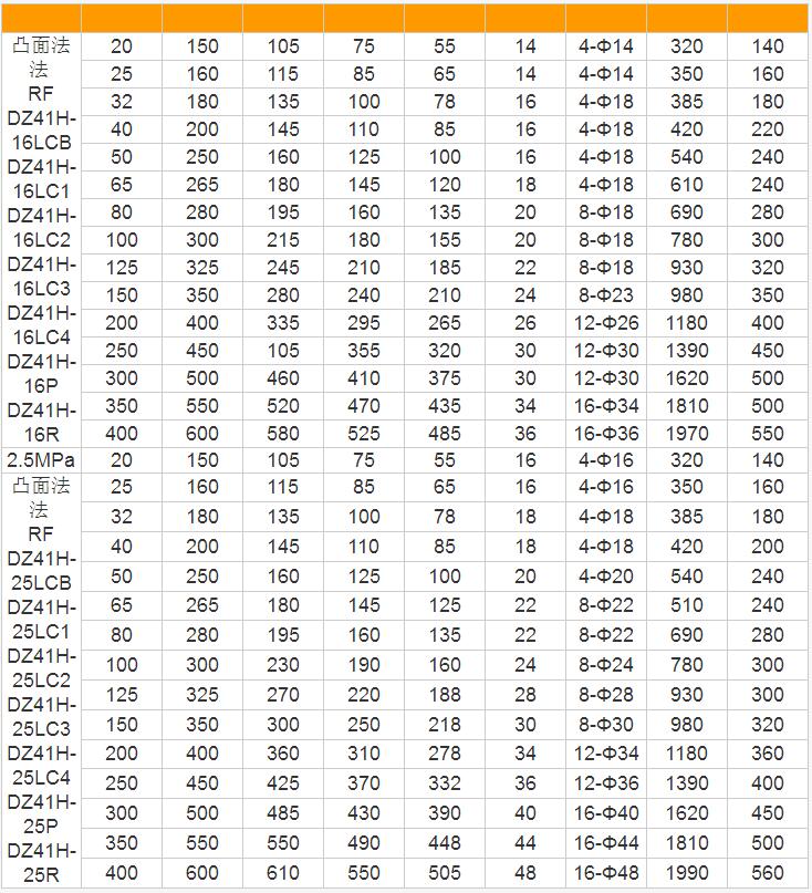 三、Z41H低溫法蘭閘閥規格主要尺寸(PN1.6MPa-2.5 MPa):